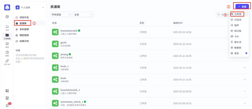 2. 2. 新建资源:在资源库中选择“新建资源”,创建一个新的工作流。
